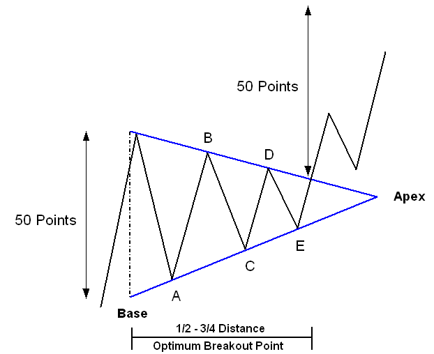 Also, after the pattern has developed, watch where the breakout occurs. The biggest moves tend to come from breakouts that happen 1/2 to 3/4 the distance from the base of the Triangle to the Apex (See diagram above). Think of a triangle as a spring being wound. At some point the pressure builds up to the point where the spring pops! If the price continues to the Apex, chances are it will be a failed pattern, and a Channel or Trading Range will emerge.