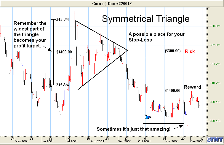 In the example below Corn entered a Symmetrical Triangle in June 2001 and the breakout came in the beginning of September. Notice how the price jumped back up towards the apex? Had you moved your stop-loss too quickly you might have gotten stopped out of this trade.
