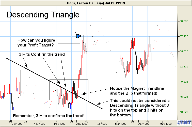 Remember that we talked about a trend taking three “hits” before it can be called a trend? Well, a triangle is generally known to take six “hits” before you can call it a triangle. Many chartists feel that a triangle will have only six “hits”, three hitting the top and three hitting the bottom. This has to do with the Elliott Wave Theory. There are many good books about this theory on the market. I might suggest that you buy one after you finish this course.