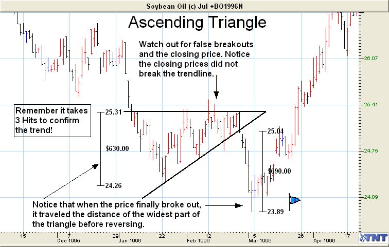 An ascending triangle is an ascending trendline with strong resistance at the top. This particular Triangle produced a profit, as the price traveled an equal distance out of the breakout compared to the widest part of the triangle.