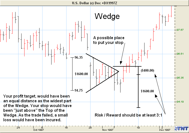 Place your order just below the wedge for a short breakout or just above it for a long breakout and use a day order only. That way, if it doesn’t get filled that day, you don’t have an open order that might get filled weeks later when you don’t want it to.