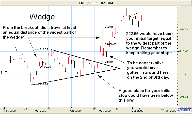 In the above chart, you can see that the breakout did in fact travel at least as far as the widest part of the Wedge. This is common and you should use this fact in determining your profit target. Sometimes the price will continue, and you could consider adding contracts at that point.