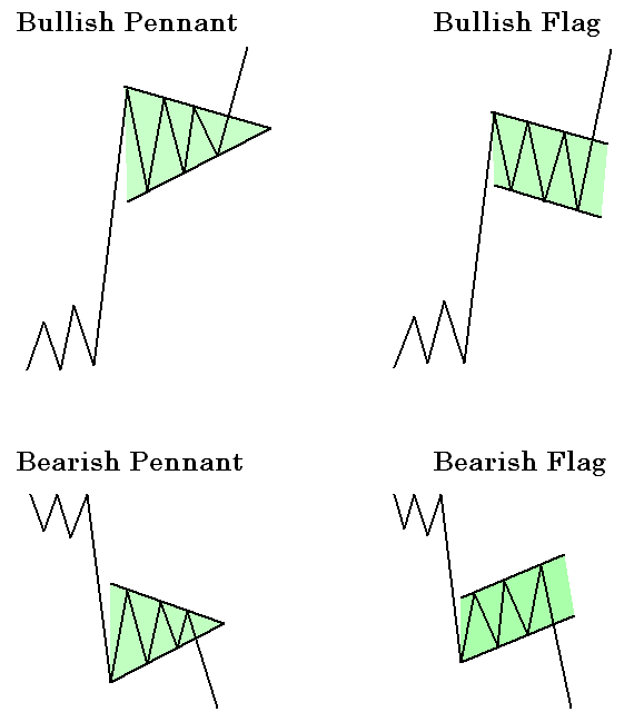 Flags and Pennants look very similar and can be treated the same. One looks like a sloping rectangle and the other looks like a small symmetrical triangle.