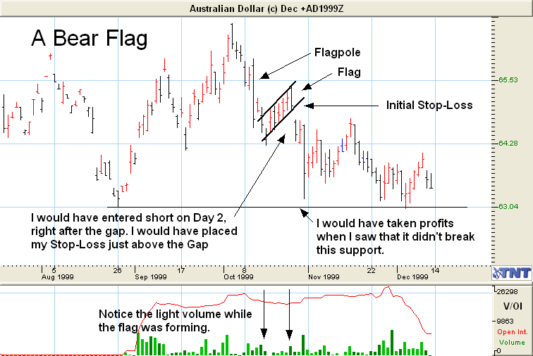Keep in mind that volume should be light in the formation stages of both Flags & Pennants. A Bull Flag as shown below should have heavy volume on a breakout to the upside. Heavy volume is not required for the breakout of a Bear Flag.