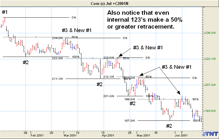 Notice that each #3 point also becomes a new #1 point for the next internal 123 formation. Keep in mind the 50% retracement rule, as it works equally well here.
