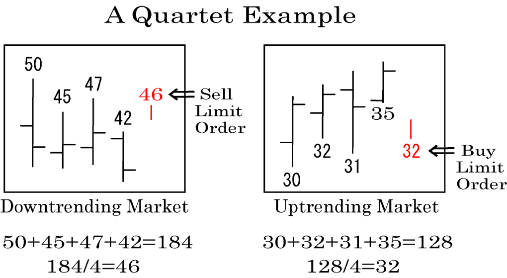 During a downtrending market you would take the highs of the last four trading days and add them together and then divide the total by four. This gives you the average of the last four day’s highs. You would then place a limit order to go short for the next trading day at this average price. In this case you would not use an alert, but a limit order as a day order only, not a GTC order.