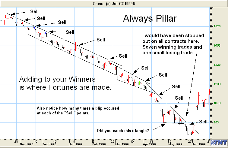 Let’s say that in the following example in Cocoa you pyramided all the way down from the top of the Channel. I’ll explain what I mean. Look at the following chart.