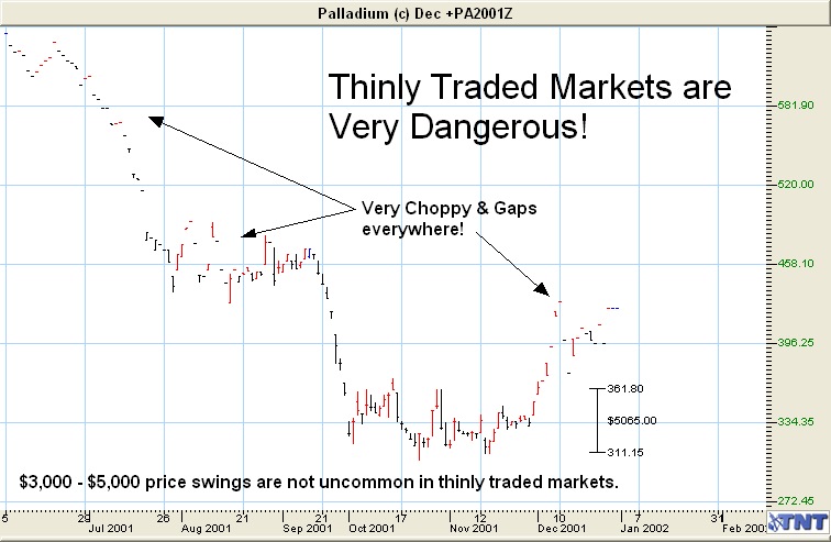 Thinly traded markets also tend to be very volatile and can have huge price swings in a day or so and slippage is even greater. Look at the Palladium chart below. It is a thinly traded market that has huge daily price swings. You can trade these markets if you like, but you must be careful if you do.
