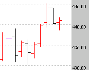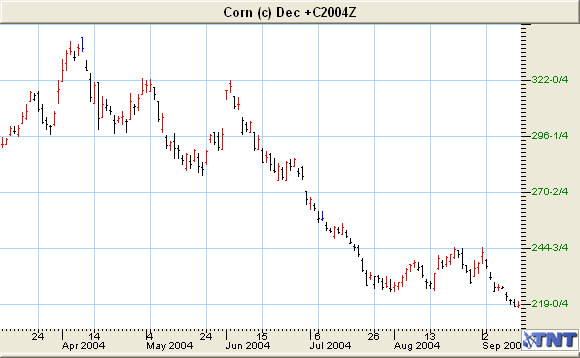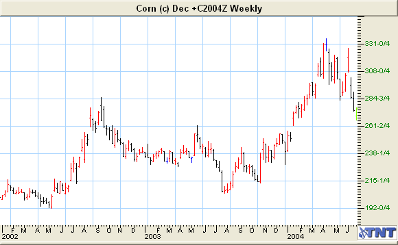 Each commodity trades in a specific contract month(See the list by clicking on each market in the software). This particular chart is for December 2004 Corn. This means, when you place an order for Corn, you would instruct the Broker which contract month (delivery month) you wished to buy or sell a contract in. As an example, the following contract for December 2004 Corn started trading back in January 2002 and expired 24 months later.
