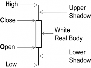 - White Real Body – When the real body is open or white, the price closed above the open and is normally seen as bullish.