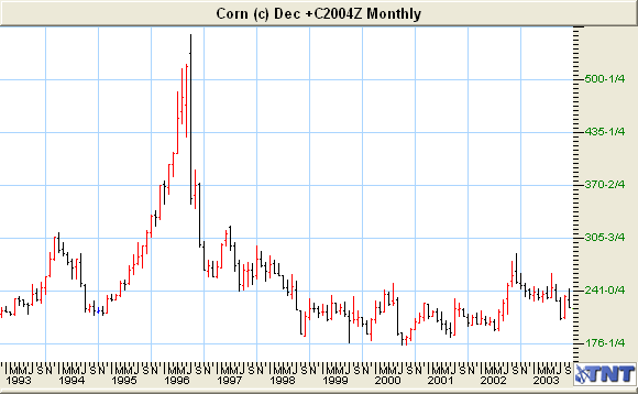 Take a look at the Monthly chart below. It shows the price of Corn over a period of 10 years. As you can see, the highest price was about $5.54 a bushel in 1996 and the lowest price was $1.76 a bushel in mid 2000.