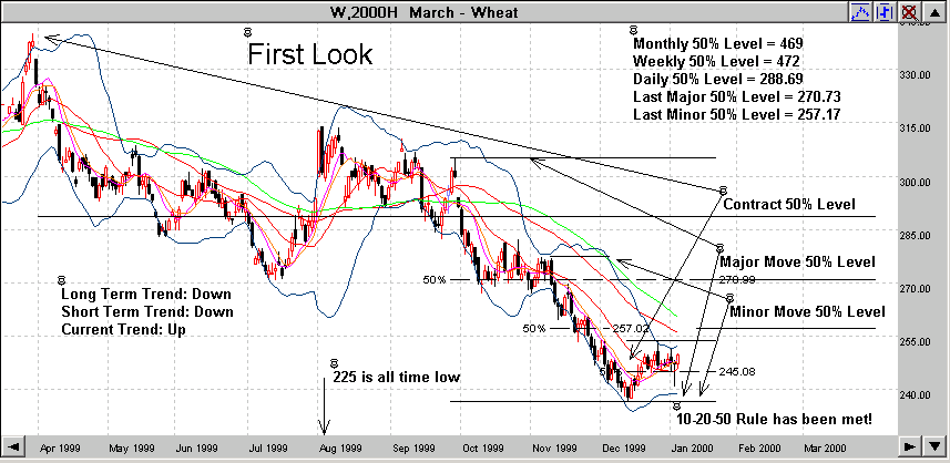 Notice that in the above chart, the 50% level of the contract also became a Common Number. If you had gone long when the price reversed at the end of November, you should have had an exit target to take profits at the 50% level. When the Top Blip formed at the 50% level, you could have gone short this market. Your initial profit target at that point could have been a 50% retracement of this last minor move down to about 53.00.