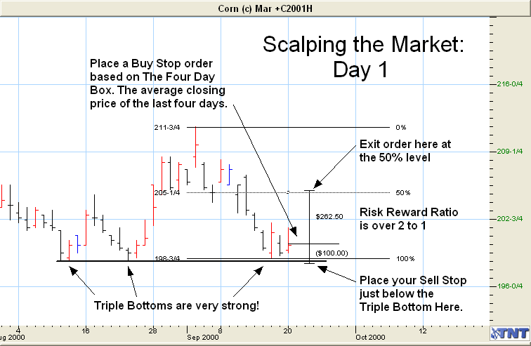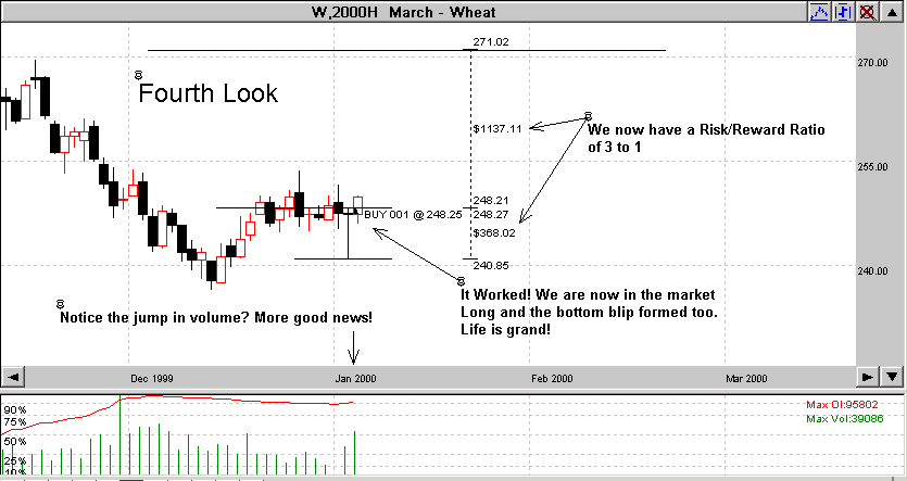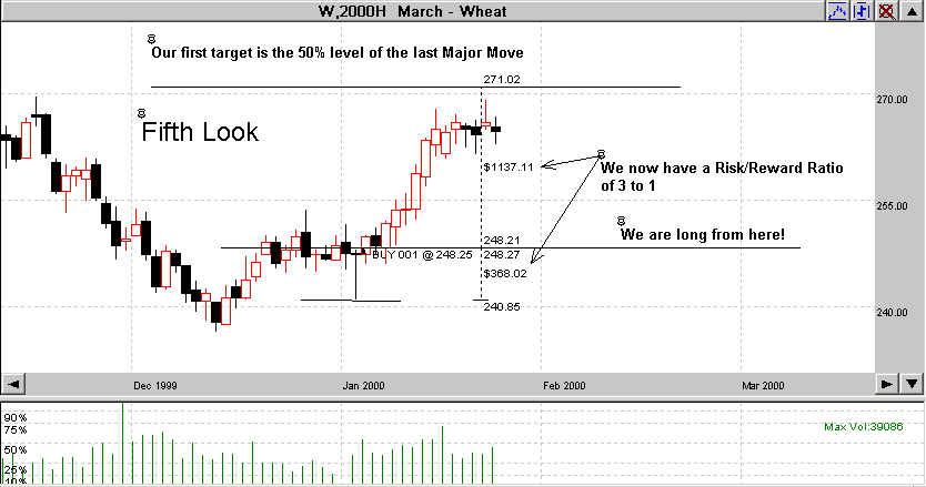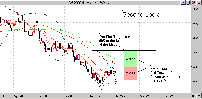 Now, let’s assume that you’ve been watching the price of corn go down and down and finally make a new one year low. (This would be a #1 point) Let’s further assume that over the next couple of weeks the formation is completed by the #2 and #3 points and that you are now long one contract because prices broke to the upside past the #2.