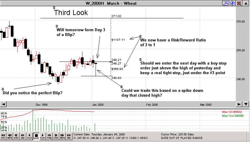 Third Look: The chart is now taking on a new look and feel. Several things are going on here. The first thing that jumps out at me is the Spike Down Day. It closed in the upper 25% of the daily trading range. Remember we talked about how to trade Spikes in a previous lesson.