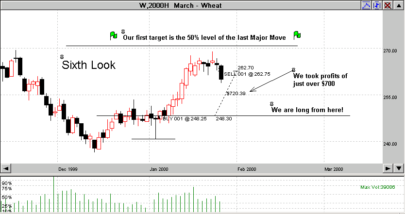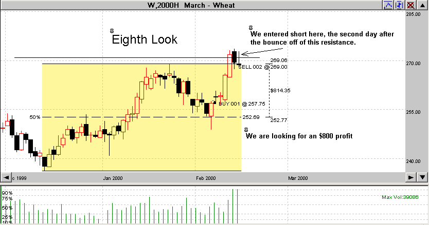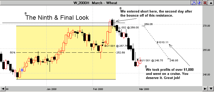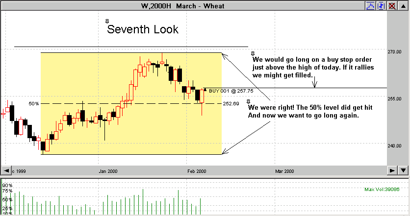 Eighth Look: As you can see, it did get hit. What do we use for a profit target? It’s the same one we’ve been using, the 50% Level of the last Major Move. So, we call our Broker, and place an exit order to take profits at the 50% level if it’s reached. Our stop could be below the low of yesterday. Let’s look and see what happens next.