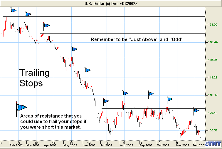 The way I decide where I want to place my stop is to look at how much risk there is at that particular price point. I then look at how much the market is moving up and down each day (market noise). I don’t want to be within the average day’s Trading Range and I don’t want to be so far out that I can’t control my risk. I then try to find a happy medium and that’s where I put my initial, or trailing, stop.
