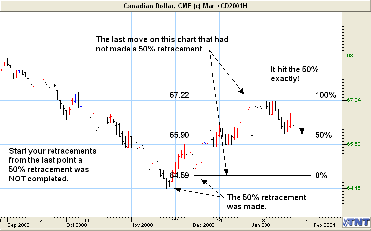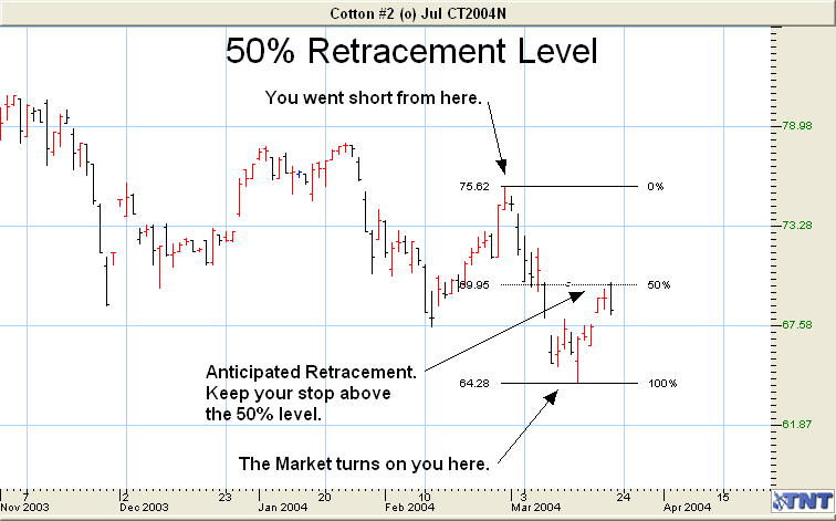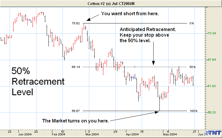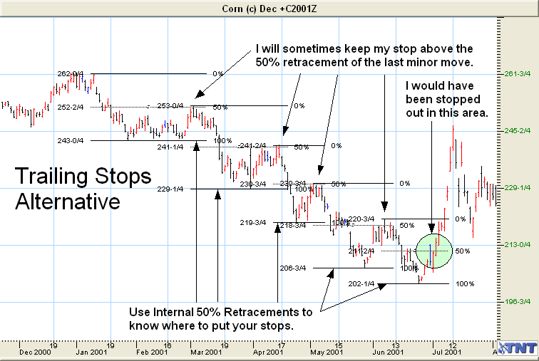 You will also want to keep moving your stops down (up when you are long) to lock in your profits. Again, make sure that your stop orders are GTC orders, not day orders. If you are currently trading, or have traded in the past, go back and look at the trades you got stopped out of. How many of them would you have stayed in and made a profit, if you had just kept your stop above or below the 50% internal retracement area?