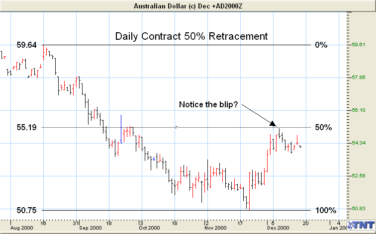 On the following chart, you can see that the last major move had yet to make its 50% retracement. However, when it did, it hit it perfectly. It also formed a bottom blip at the same time.