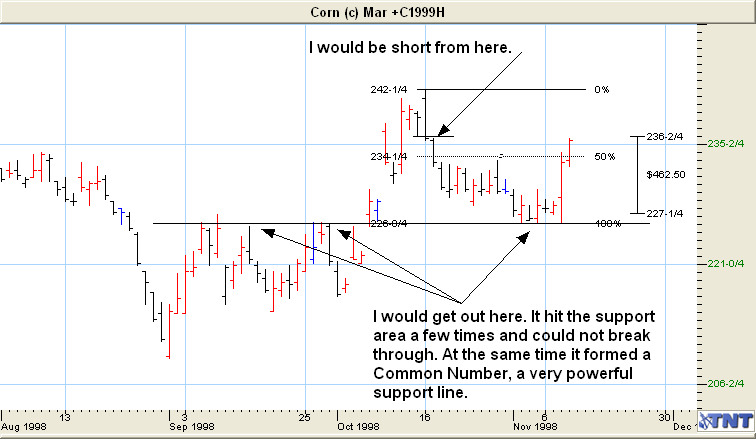 You can see on the above chart, that you are short the market. About 2 1/2 weeks into the trade, the market turns against you. Another trading dilemma! Do you get out or stay in? Just looking at this chart, I would stay in the market, anticipating a 50% Internal Retracement from the last minor move. I would make sure that my stop was “just above” the 50% level here and just above any other resistance level that might be at or about the same price.