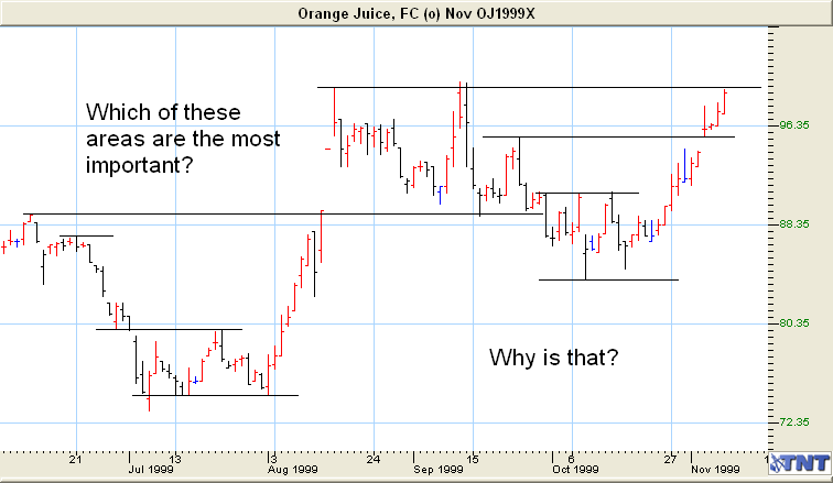 Volume: Heavy volume means that a lot of contracts were traded in that price range. Of course when 5,000 contracts were traded and the price remained in the same support or resistance area, then that area is more important than if just 1,000 contracts were traded in the same period of time.
