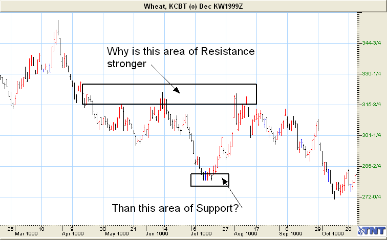 Look at the following chart. Why is the resistance area in the top box stronger than the support area in the bottom box? I bet you know! By now, you should be looking at charts a little bit differently than you have in the past. At least I hope so anyway.