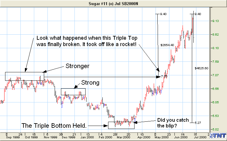 As you can see in the above chart, we have both Triple Tops and Triple Bottoms. Let’s look at the Triple Bottom here. When the price hit the bottom support for the third time, notice it “took off” and rallied. I will always trade a Triple Top or Bottom. Yes, I said always!
