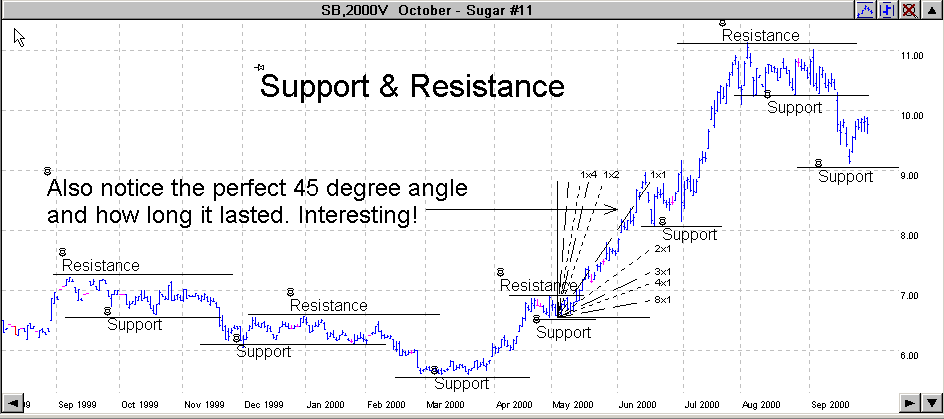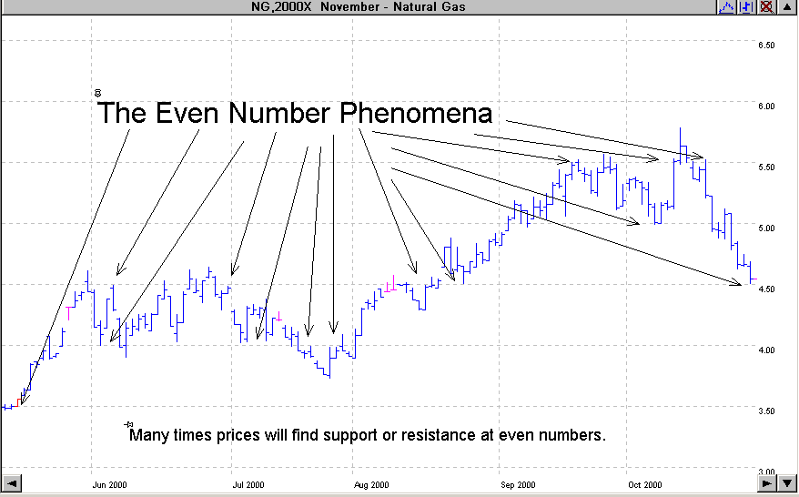 For some reason prices tend to find major support and resistance at even numbers. Many times the price will rally or decline and stop at an exact even number. Many times it will be a multiple of 10; like 10, 20, 50, 100, 150 etc. I’m not sure why this actually happens. I’ve just noticed it many times on charts but go back to your own charts and see for yourself.