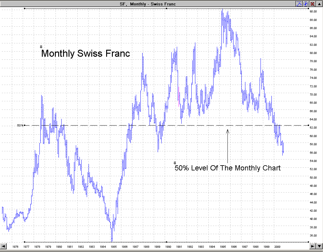 To start, let’s do a 50% level on a Monthly chart on the Swiss Franc. This chart reflects the prices paid over the last 25 years.