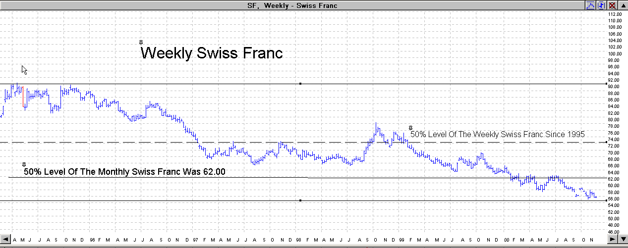 The highest price paid was 91.00 in 1995 and the lowest price paid was 56.00 in November 2000. We figure it the same way we did on the monthly. 91 + 56 = 147 / 2 = 73.50. So, 73.50 is the 50% level of the Weekly Swiss Franc.