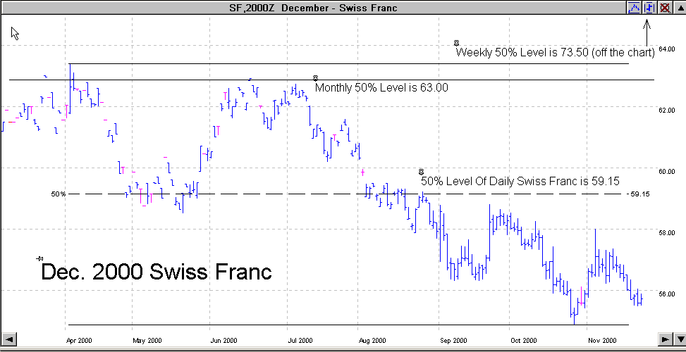 At some time, prices will do a 50% retracement of the Daily, then the Weekly, and then Monthly charts, but not always in that order. On the previous chart of the Swiss Franc, they would have to make a 50% retracement of the Daily, then the Monthly and lastly, the Weekly.