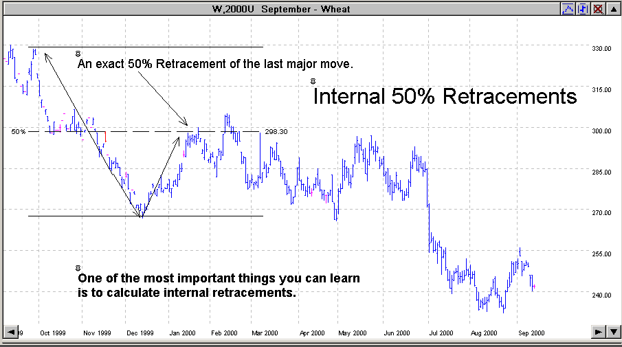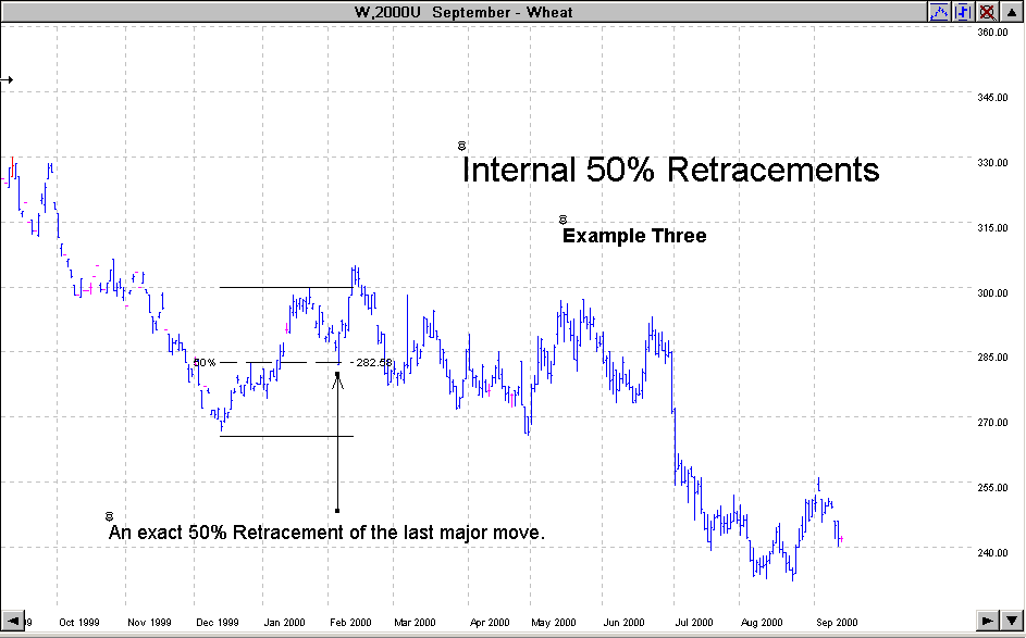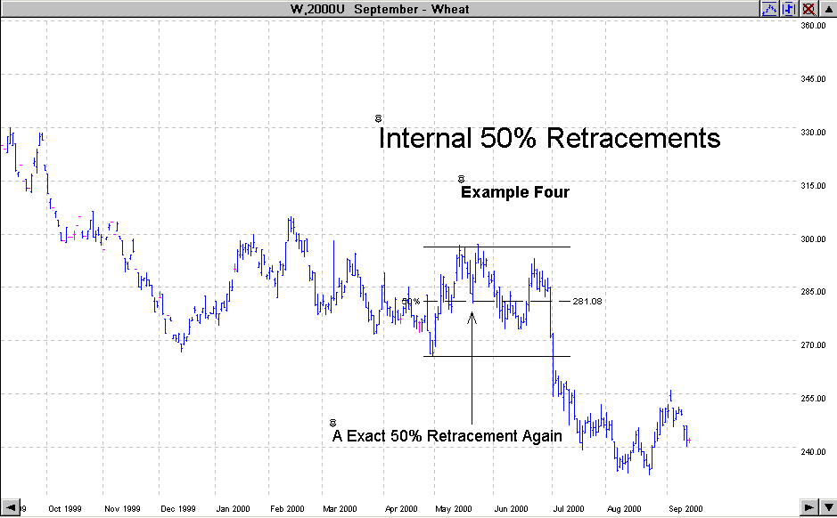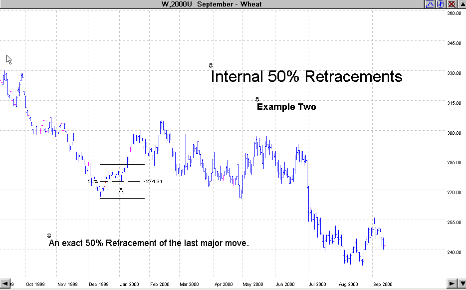 I’m going to show you the same chart as above, September 2000 Wheat, in several views. I want you to notice how many times these internal 50% retracements took place. Many times they will make more than a 50% retracement. The point to remember is that most of the time, they make at least a 50% retracement before turning back around again.