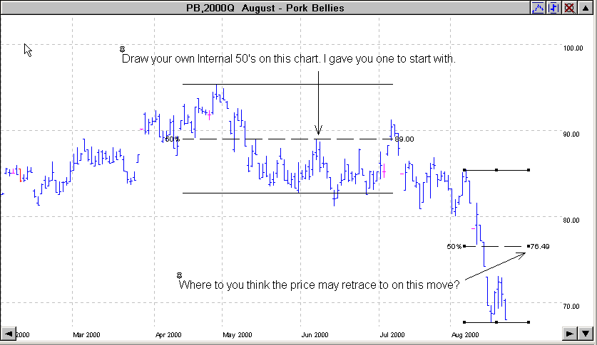 On the following chart I would like for you to draw out some Internal 50% Retracements that have already taken place. Then on the last major move that took place, do you think it might also make a 50%, or more, Internal Retracement? Get used to drawing these out on the charts. By the way, the Track N Trade software does this for you with just two clicks!