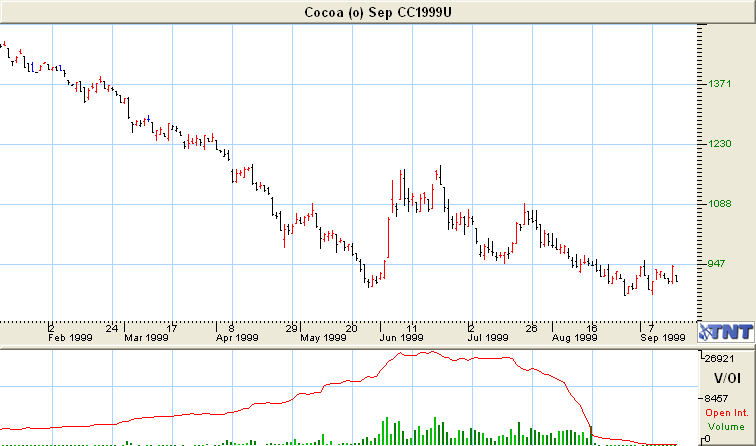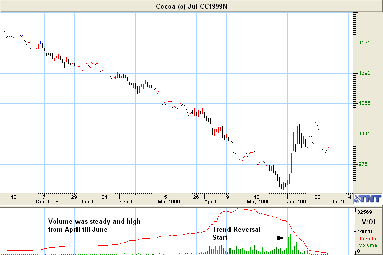 Even though the trend was down from last November and December, you will notice that there was not much volume at the beginning of the July contract. Why? It’s because in December 1998, the July 1999 contract was a little too “far out” (too many months ahead) to trade, and most people would have been trading the closer in months. Should you have wanted to trade the July 1999 contract back in December 1998, you could have been watching the volume on the front month in December, which would have been the January or February contract. I assure you, the volume during the front month was up.