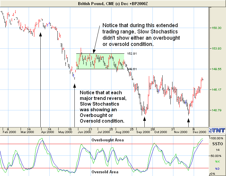 On the chart above, notice that at each trend reversal, Slow Stochastics was showing an overbought or an oversold condition. You can use this indicator to help confirm what you feel could be a trend reversal based on what the chart is showing you. Did you catch the Double Bottom?