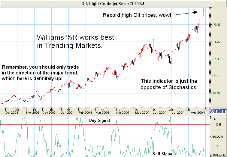 Let’s take a look at the following chart using the %R indicator and see what the chart looks like with it. %R works best in trending markets so don’t rely on it in choppy markets like a Trading Range.