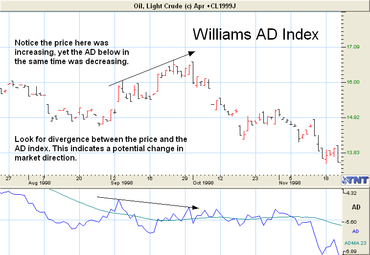 The Williams’ Accumulation/Distribution index (AD) study attempts to measure market pressures. It specifically looks for market formula. The study serves to measure market strength and sentiment. You can use the normal technical tools on the study, i.e. trendlines, breakouts, support & resistance. However, you must watch for instances of substantial divergence from the AD index versus the underlying chart as the key to future price direction.