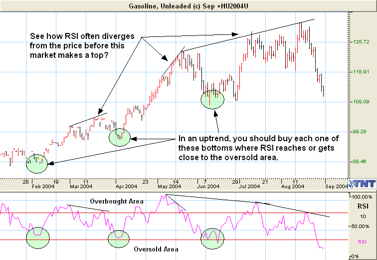 As you can see, during this uptrend each time the RSI indicator dropped near to or below the 30% (Oversold Area) the price rallied. The typical Buy signal would be to wait until RSI dropped below 30% and Buy when it moved back above the 30% line, and the same goes for selling after RSI moves above 70% and drops back down. However, in the case of the uptrend in Gasoline above, RSI didn’t reach the oversold area and you would have missed out on a couple of good chances to enter this market. Only use this in Trending Markets, and trade in the direction of the trend. Also use this along with the other indicators and your own trading plan too. Don’t use it as a “stand alone” signal.
