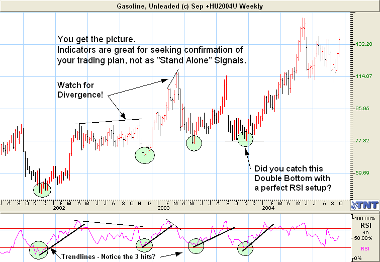 Plot Trendlines On The RSI Charts, Too! Just like you would draw trend lines on a bar chart, you can draw trend lines using the RSI levels as well. I did this so you can see how this could be of help. Like in all momentum oscillators, look for a divergence.