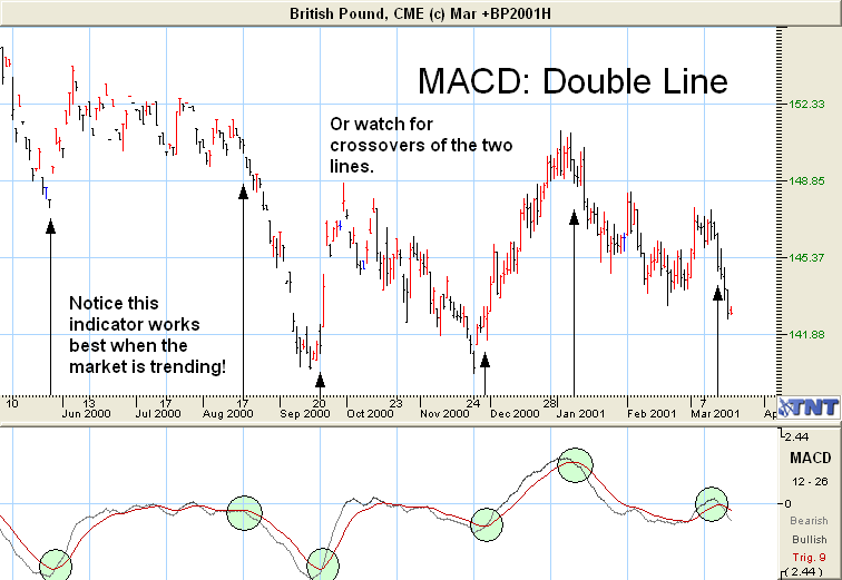 MACD Double Line: This is the same oscillator except it’s shown in double line form. Remember, Momentum indicators work best in trending markets, not sideways markets.
