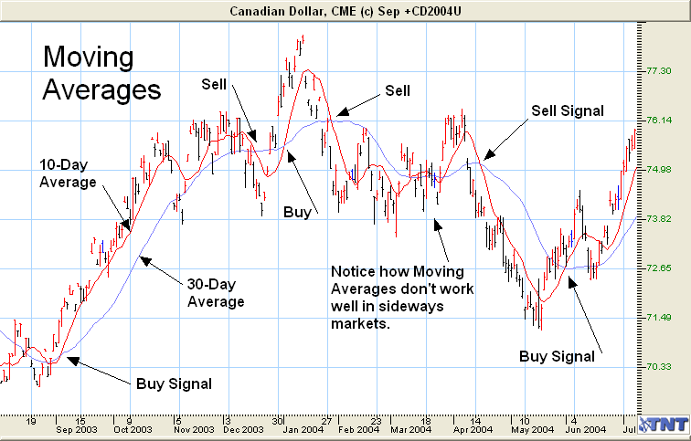 These days, using a computer and charting software, you can use it to set up any time frames you want. It could be a 5-day and 60-day setup if you like. I tend to use 10 and 30 period time frames myself, and a 9 for the very short and 200 for the long term (Depending on what and how you are trading). Most will give you fairly accurate indications of when the trend has changed. Keep in mind that Moving Averages work best in trending markets! Also, by their very nature, Moving Averages lag behind what the market is actually doing. They usually confirm a trend change rather than predict a trend change.