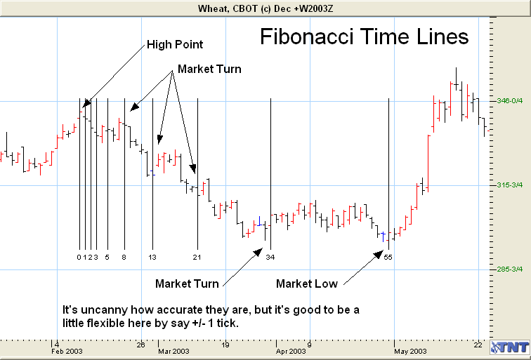Time Lines are vertical lines drawn at Fibonacci Intervals from the significant high or low of the trend. In theory, future turning points should coincide near these time lines.