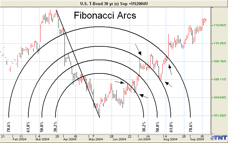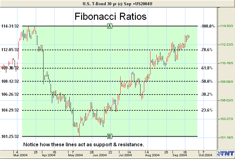 (For you math types) the Fibonacci number sequence is created by adding the last two numbers in the sequence to the next number. (i.e.1, 1, 2, 3, 5, 8, 13, 21, 34, 55, 89, 144 and on to infinity). The first three numbers are usually dropped for analysis purposes. These number sequences create some interesting mathematical relationships. The most commonly used sequences are: the ratio of any number to its next higher number which approaches a constant value of .618 (i.e. 34/55=.618); the ratios of alternative numbers which approach a constant .382 (i.e. 21/55=.382, 34/89=.382).