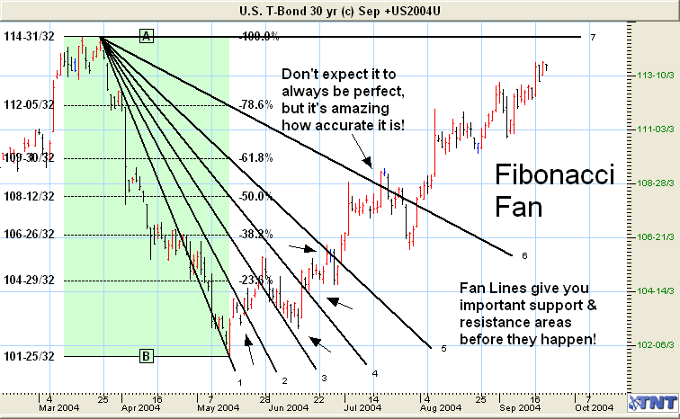 Fan Lines are drawn using the same ratios as before, .786, .618, .50, .382, and .236 from the same high and low point on the chart. Fan lines are then drawn connecting the dividing points of each ratio along the Fibonacci Ruler.