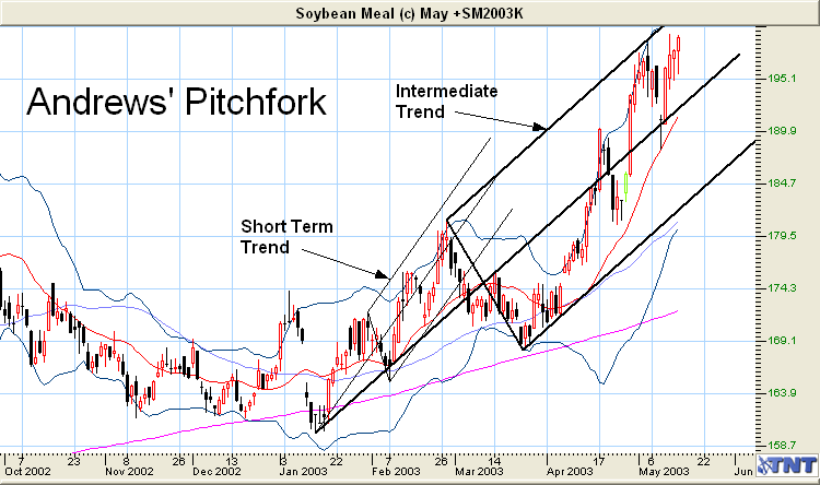 Let’s take a look at a chart with Andrews’ Pitchfork drawn on both the Short Term and Intermediate Trends.