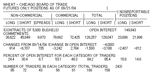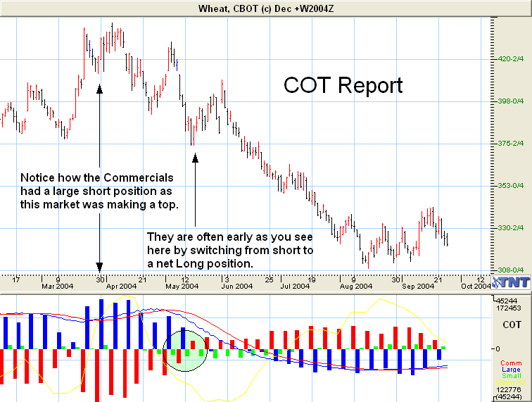 Look at the following chart for December 2004 CBOT Wheat so you can see what the report relates to. Notice that the COT report is from September 21, 2004. Currently the Commercials are net long at this market is bottoming. If you are short this market and you see the Commercials building up a long position, you might ask yourself why.