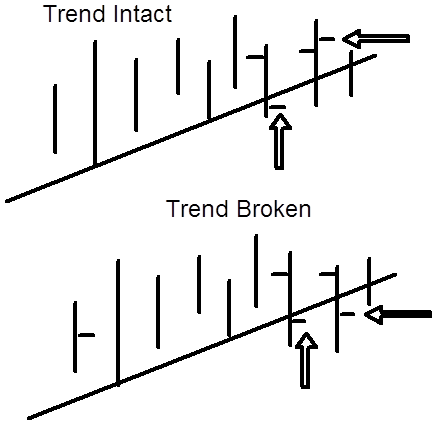 The Bottom diagram shows the trend being broken, since the price did close below the trendline for two consecutive periods.