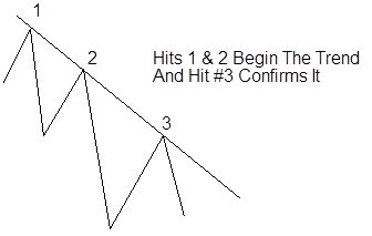 When you draw your trendlines, you must get three “hits” in order to confirm the trend. Let’s look at the following diagram to see what I mean.