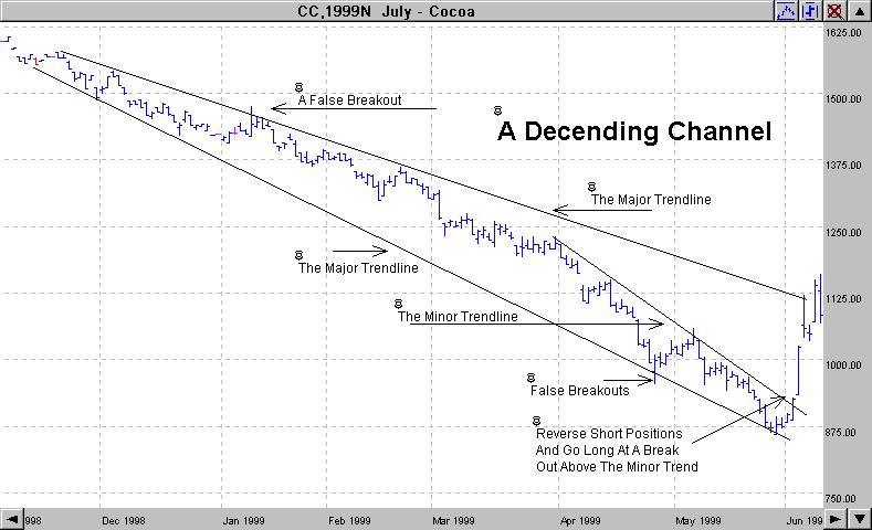 By drawing trendlines, you can see when the breakout of the downtrend occurs, and the price starts heading back up. Look again at the previous chart for July 1999 Cocoa. I’ve drawn the trendlines for you. It’s obvious when this trend ended and the price reversed direction. When the price reversed and went up, you would want to be out of all your short trades, and go long, or buy a contract. Remember, when you go short, you sell a contract, and when you go long, you buy a contract.