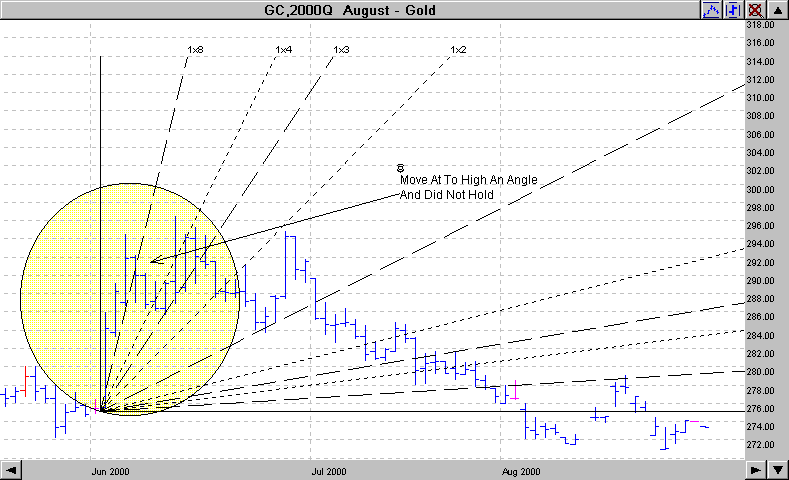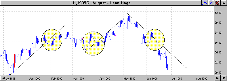 You can see that this happened three times on the following chart of Aug. 1999 Lean Hogs. Isn’t this interesting! So keep your old trendlines on the charts you draw, as they may act like a magnet and draw the prices to them. We will cover this later in more detail but check out the following chart.
