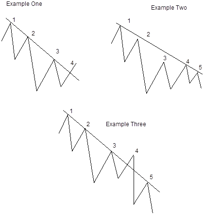 On the other hand, if the price did not rise (example three), then I would continue the trendline as it was in example one, and would consider point #4 where it broke out of the trend, as a false breakout.